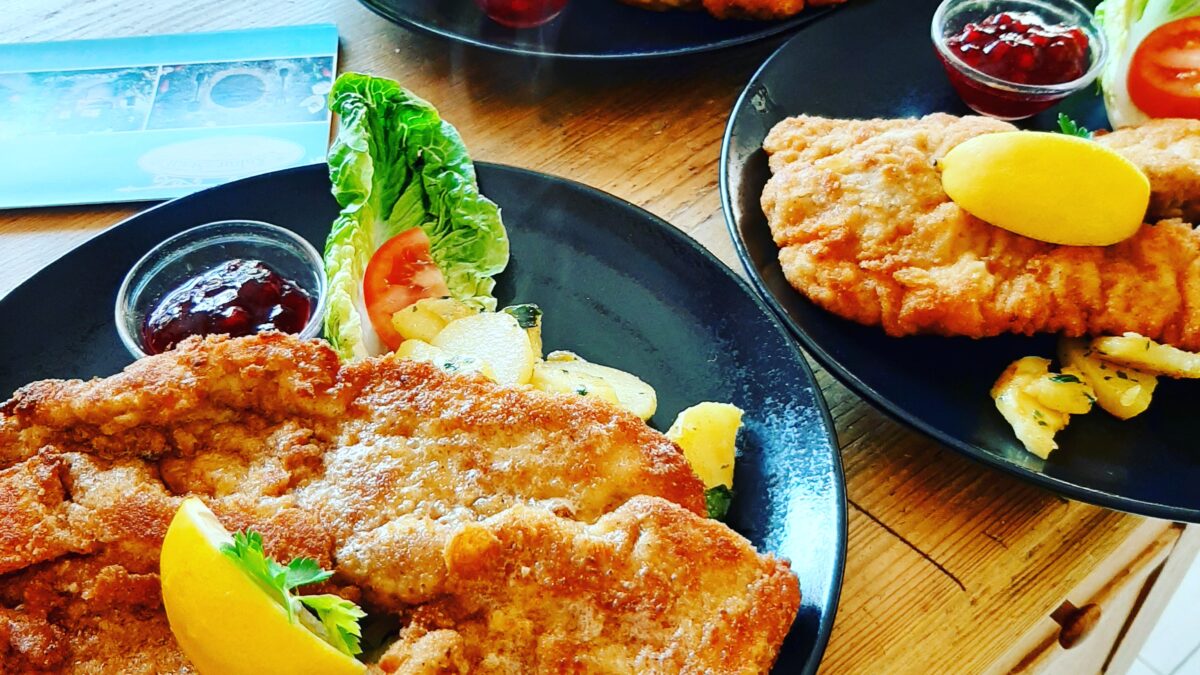 Schnitzel ,,Wiener Art” mit hausgemachtem Kartoffelsalat und Wildpreiselbeeren € 14,80